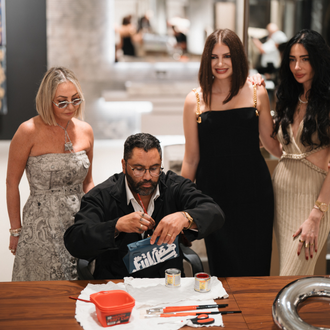 The collaboration extended to fashion, with RETNA customizing a luxury bag from JaneFinds, blurring the lines between art and collectible design.