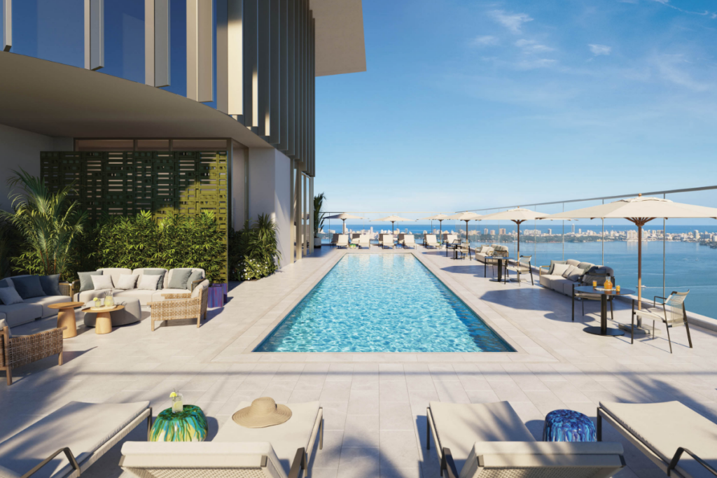 Rooftop Skydeck: A panoramic pool, sunset lounge, and private dining room with breathtaking views of Biscayne Bay and the Miami skyline.