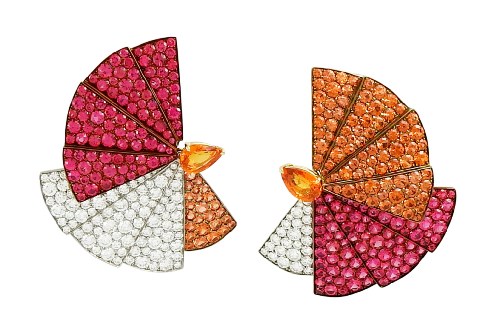 These fan-shaped earrings are a dazzling mix of orange sapphires, red spinel, and diamonds, set in gold and titanium. With 1.61 carats of pear-cut orange sapphires, 3.25 carats of round orange sapphires, 4.46 carats of red spinel, and 2.71 carats of diamonds, they are a true celebration of color and craftsmanship.