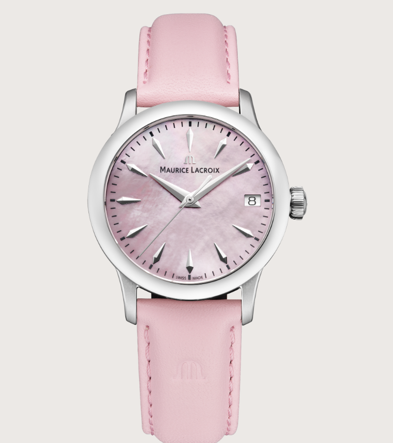 The Maurice Lacroix 1975 Quartz 33 mm is a masterpiece of Swiss watchmaking. Its polished bezel, sun-brushed dial, and optional diamond-encrusted bezel (0.67 carats of responsibly sourced diamonds) make it a statement piece. The pink calf leather strap and delicate mother-of-pearl dial add a romantic touch, while the slim 8.4 mm case ensures comfort and sophistication.